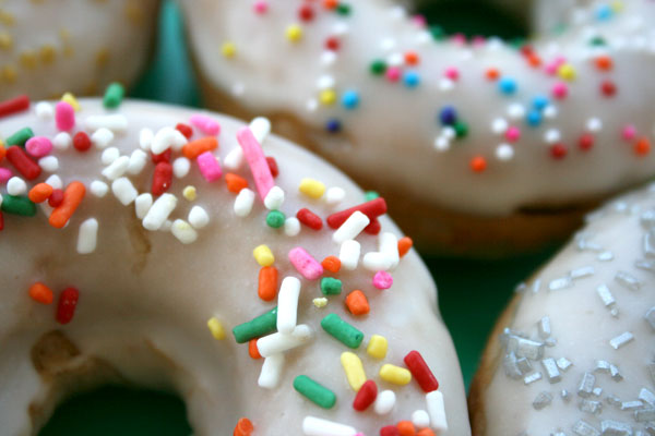 Allow to cool slightly before removing from pan, about 5 minutes. Dip donuts into strawberry frosting 1-3 times, depending on how thick you’d like them frosted. Top with sprinkles.